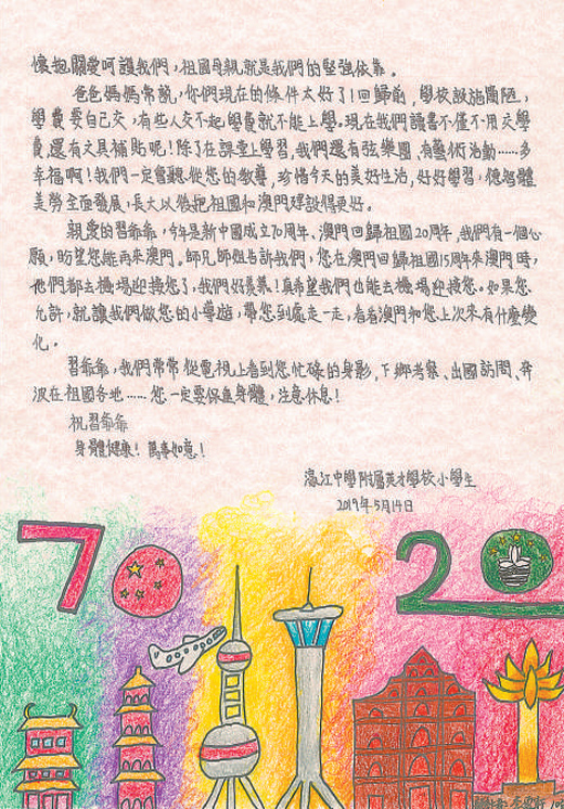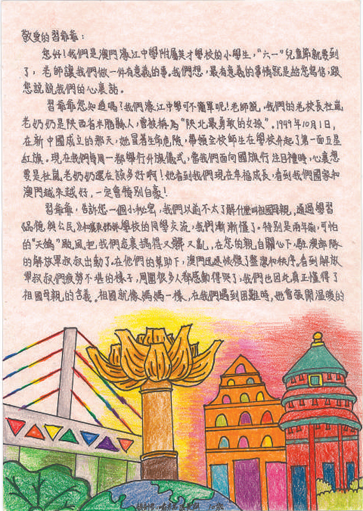 濠江中學創(chuàng)建于1932年,以愛國愛澳、為社會培育人才為辦學宗旨,是澳門中小學生人數(shù)最多的學校。該校素有愛國主義傳統(tǒng),1949年10月1日新中國剛剛成立,時任校長杜嵐就帶領學校師生升起了第一面五星紅旗。近日,濠江中學附屬英才學校的小學生給習主席寫信,講述了他們對“祖國母親”含義的理解,表達了長大后把祖國和澳門建設得更美好的決心。