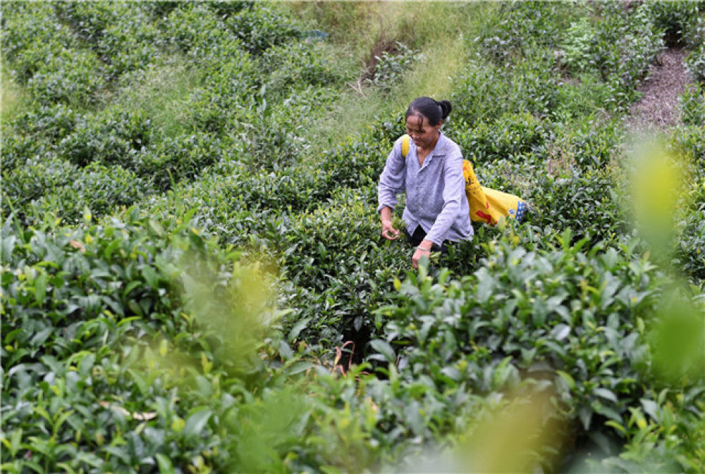 8月8日,下黨村村民在扶貧定制茶園內(nèi)采茶。新華社記者 林善傳 攝