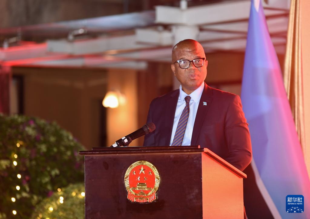 9月25日,在博茨瓦納首都哈博羅內(nèi),博茨瓦納總統(tǒng)事務(wù)部長莫瓦薩在慶祝中華人民共和國成立76周年招待會上講話。新華社發(fā)(策基索·特巴洛攝)