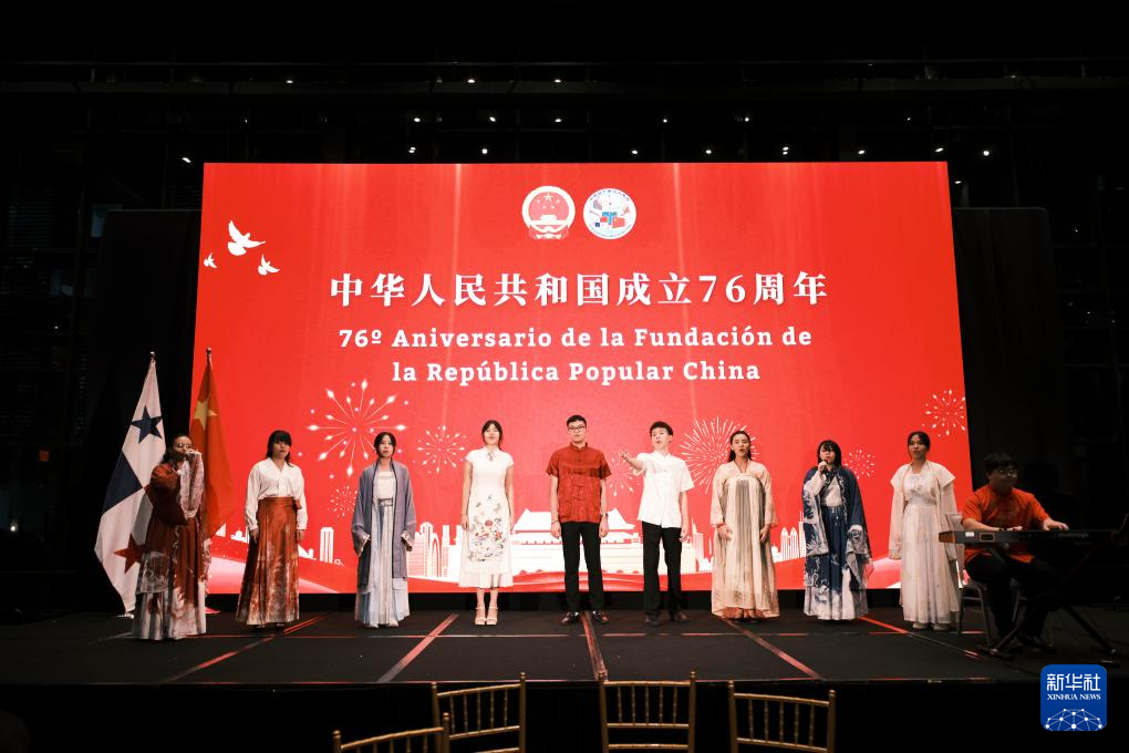 9月22日,在巴拿馬首都巴拿馬城,當(dāng)?shù)厍嗄暝趹c祝中華人民共和國成立76周年招待會上合唱中文歌曲。新華社記者 許詠政 攝