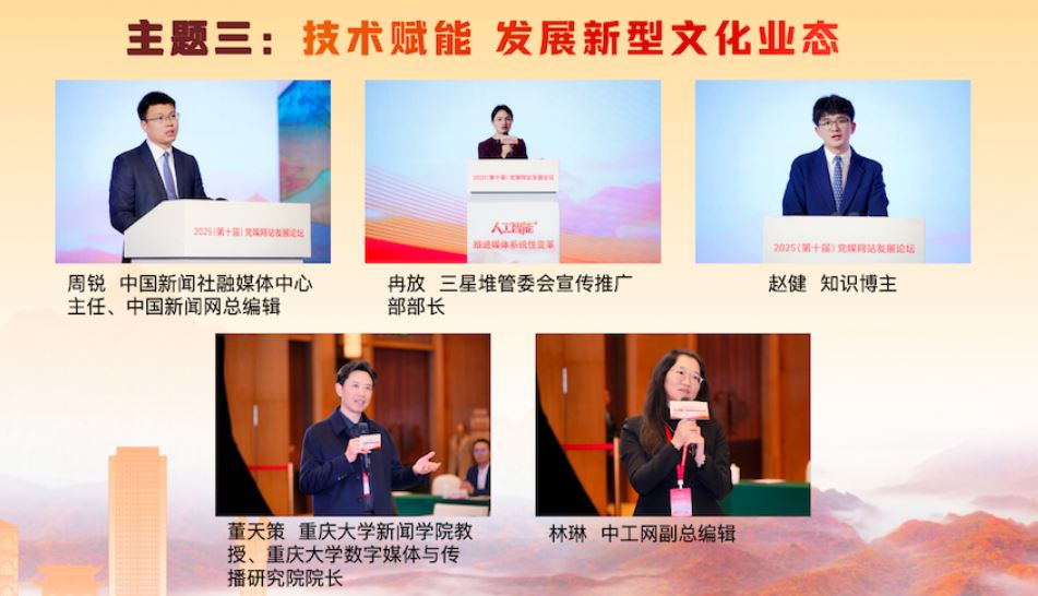 在“技術(shù)賦能 發(fā)展新型文化業(yè)態(tài)”主題研討環(huán)節(jié),中國(guó)新聞社融媒體中心主任、中國(guó)新聞網(wǎng)總編輯周銳,三星堆管委會(huì)宣傳推廣部部長(zhǎng)冉放,知識(shí)博主趙健,分別就技術(shù)賦能中華文化“破圈”出海、三星堆文化傳播數(shù)智實(shí)踐、短視頻文化傳播等方面的經(jīng)驗(yàn)成果進(jìn)行了精彩展示。重慶大學(xué)新聞學(xué)院教授、重慶大學(xué)數(shù)字媒體與傳播研究院院長(zhǎng)董天策,中工網(wǎng)副總編輯林琳作為互動(dòng)嘉賓進(jìn)行了點(diǎn)評(píng),期待主流媒體發(fā)揮傳播實(shí)踐智慧,在內(nèi)容、技術(shù)和社會(huì)責(zé)任之間找到平衡,鑄造中華文化新輝煌。