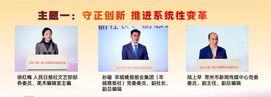 在“守正創(chuàng)新 推進(jìn)系統(tǒng)性變革”主題研討環(huán)節(jié),人民日?qǐng)?bào)社文藝部部務(wù)委員、美術(shù)編輯室主編徐紅梅,羊城晚報(bào)報(bào)業(yè)集團(tuán)(羊城晚報(bào)社)黨委委員、副社長(zhǎng)、副總編輯孫璇,常州市新聞傳媒中心黨委委員、副主任、副總編輯陸上早分別作主旨發(fā)言,介紹了各自領(lǐng)域推進(jìn)系統(tǒng)性變革、發(fā)展新時(shí)代中國(guó)特色社會(huì)主義文化的實(shí)踐與探索。徐紅梅表示,“每日讀畫(huà)”采取“AI+美術(shù)”“微視頻+夜讀”的形式,堅(jiān)持“讀準(zhǔn)、讀細(xì)、讀新、讀美”,讓AI成為深入畫(huà)境、開(kāi)啟古今對(duì)話的共創(chuàng)者,以動(dòng)態(tài)轉(zhuǎn)譯、意境擴(kuò)展、流程再造、視聽(tīng)融合開(kāi)發(fā)美術(shù)融媒的敘事潛能,深入挖掘中華文明賡續(xù)傳承的基因密碼,成為探索主流媒體系統(tǒng)性變革的微觀樣本。孫璇表示,羊城晚報(bào)全面啟動(dòng)系統(tǒng)性變革,以做強(qiáng)媒體、文化、數(shù)據(jù)、產(chǎn)業(yè)四個(gè)戰(zhàn)略板塊為重點(diǎn),把“技術(shù)賦能”嵌入系統(tǒng)性變革各關(guān)鍵板塊,積極增強(qiáng)文化傳播、促進(jìn)文化交流和繁榮文化生產(chǎn)。陸上早表示,常州借“蘇超”東風(fēng),走出城市轉(zhuǎn)型與能級(jí)躍升之路。改革的推進(jìn)需聚焦六大方向:組織體系化,內(nèi)容精品化,傳播移動(dòng)化,技術(shù)現(xiàn)代化,分配績(jī)效化,干部年輕化。