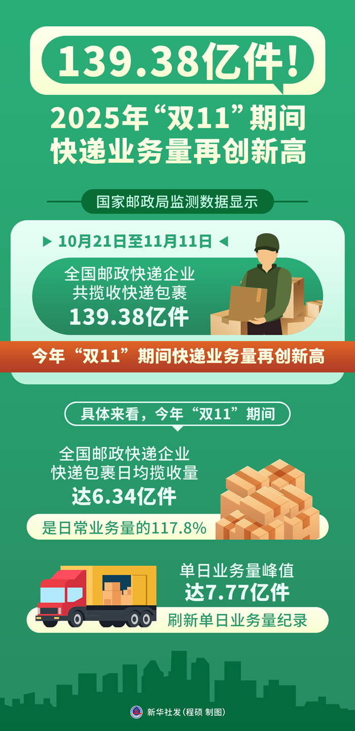新華社北京11月12日電(記者葉昊鳴)記者11月12日從國家郵政局獲悉,國家郵政局監(jiān)測數(shù)據(jù)顯示,10月21日至11月11日,全國郵政快遞企業(yè)共攬收快遞包裹139.38億件,今年“雙11”期間快遞業(yè)務量再創(chuàng)新高。