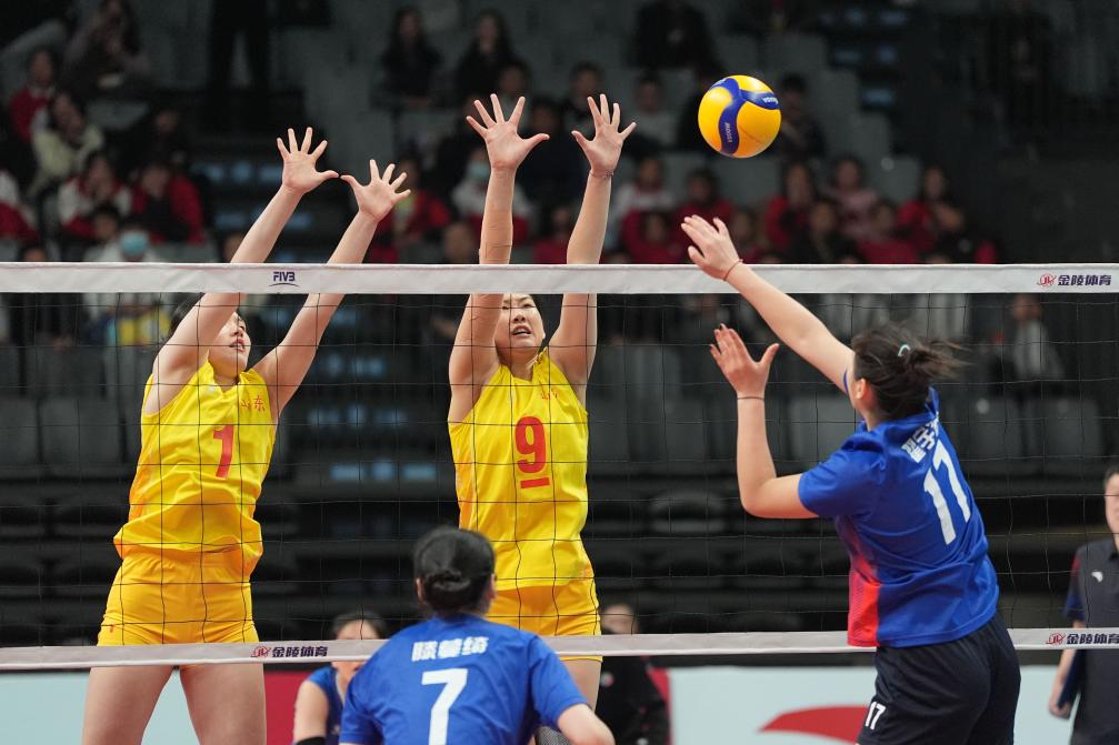 11月27日,山東隊球員李晨瑄(中)、李美君(左)在比賽中攔網。當日,在湖南省長沙市賀龍體育館舉行的中華人民共和國第一屆青少年三大球運動會排球女子決賽中,山東隊3比0戰(zhàn)勝江蘇隊,獲得冠軍。新華社記者 薛宇舸 攝