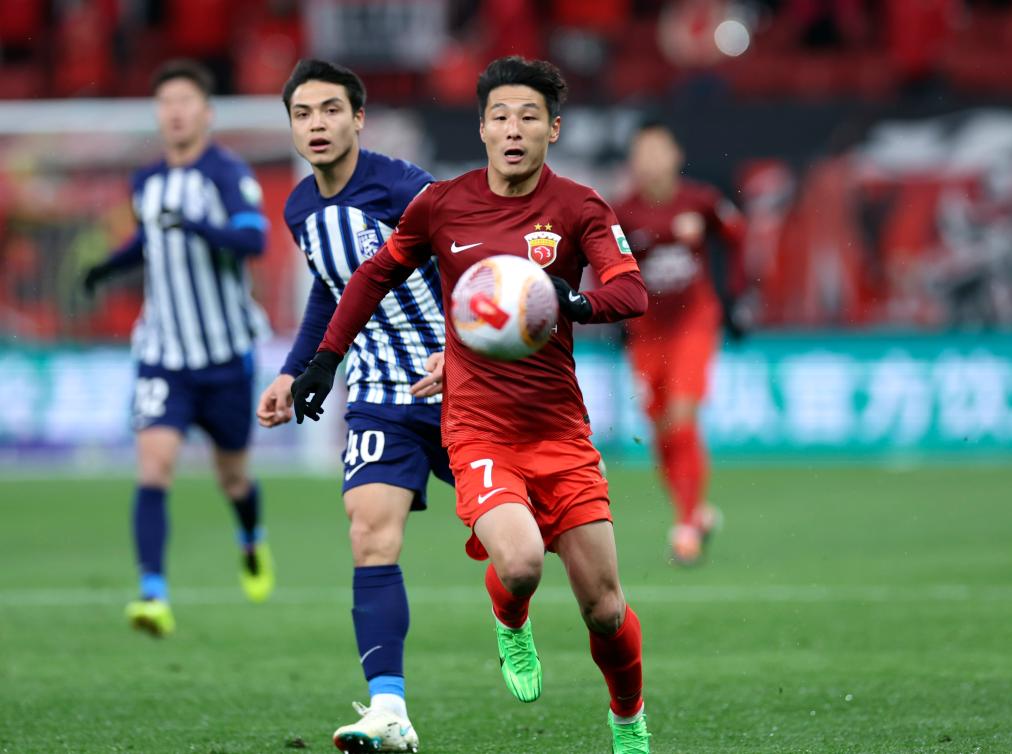 資料圖:2024年3月1日,上海海港隊(duì)球員武磊(右)在2024賽季中國(guó)足球協(xié)會(huì)超級(jí)聯(lián)賽揭幕戰(zhàn)中。新華社發(fā)(海沙爾攝)