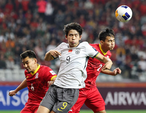 2月15日,中國隊球員劉誠宇(中)在比賽中爭頂。當(dāng)日,在深圳舉行的2025亞足聯(lián)U20亞洲杯小組賽中,中國隊5:2戰(zhàn)勝吉爾吉斯斯坦隊。新華社記者 劉大偉 攝
