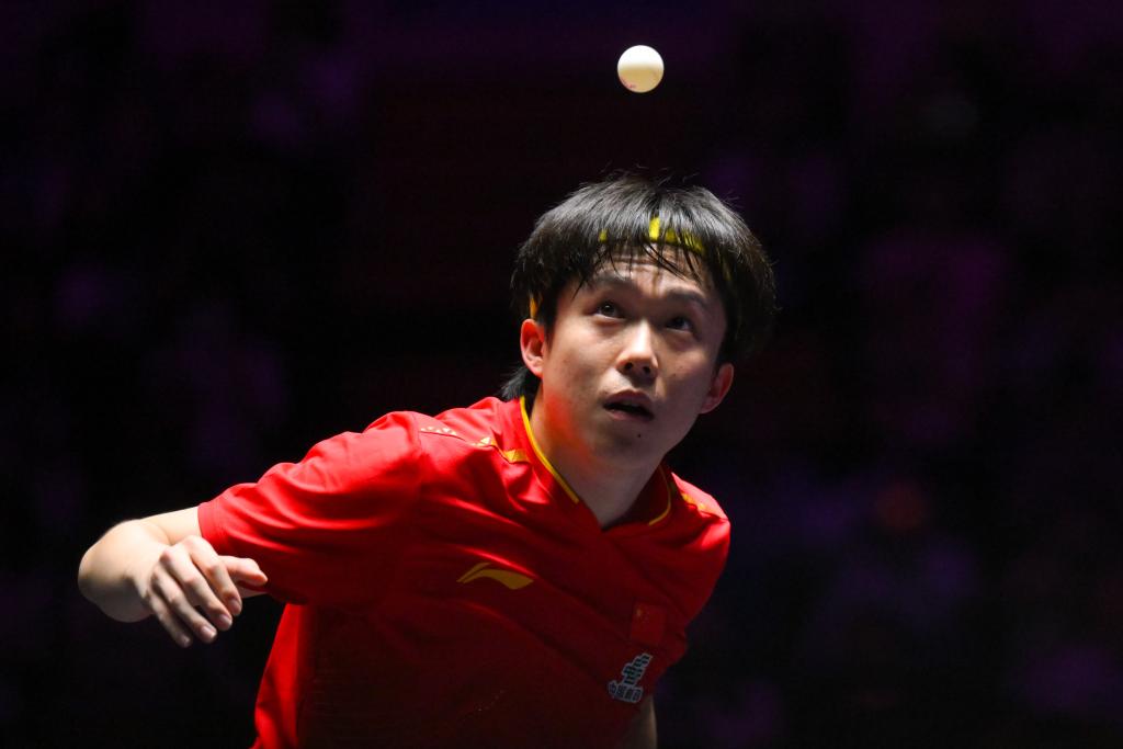 9月11日,王楚欽在比賽中發(fā)球。新華社發(fā)(張金加攝)
