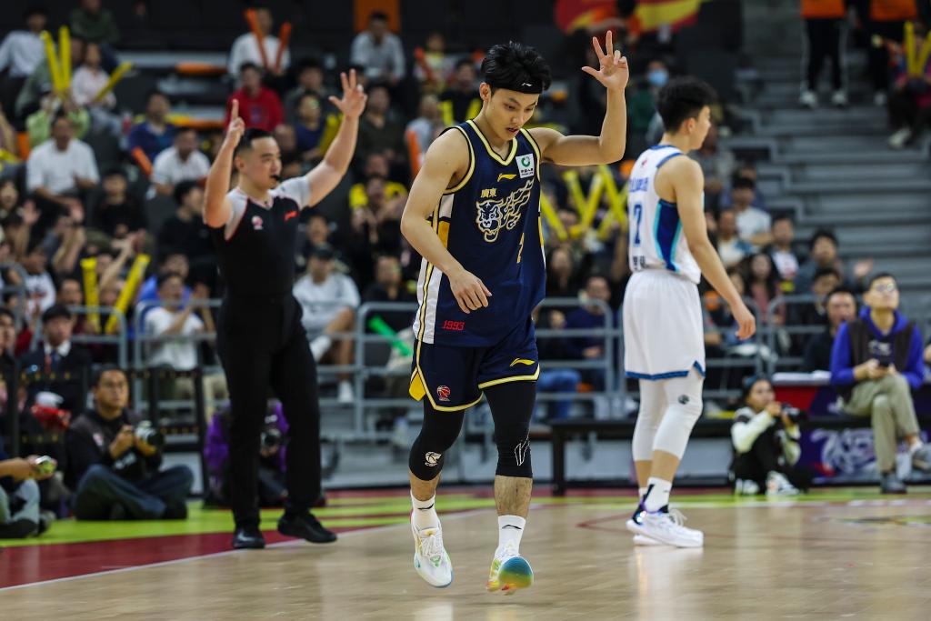 廣東隊球員徐杰(中)在比賽中投進(jìn)三分球后慶祝。新華社發(fā)(鄭家雄攝)