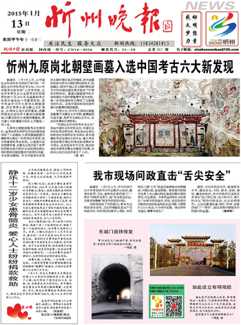 2015年1月9日上午,從中國社會(huì)科學(xué)院學(xué)術(shù)報(bào)告廳舉行的“中國社會(huì)科學(xué)院考古學(xué)論壇·2014年中國考古新發(fā)現(xiàn)”上傳來消息,論壇評(píng)審委員會(huì)從全國考古機(jī)構(gòu)推薦的數(shù)十項(xiàng)2014年全國最新考古發(fā)現(xiàn)中遴選出六項(xiàng)重要發(fā)現(xiàn),其中忻州市九原崗北朝壁畫墓,同甘肅肅北縣馬鬃山玉礦遺址、云南祥云縣大波那墓地、西藏阿里地區(qū)故如甲木墓地和曲踏墓地、內(nèi)蒙古陳巴爾虎旗崗嘎墓地、貴州遵義市新蒲播州楊氏土司墓地一同入選。