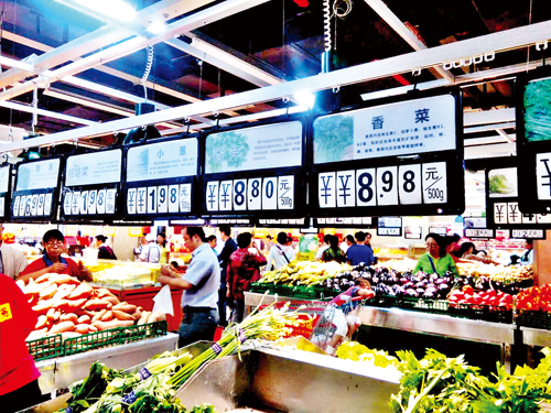 在超市水果專(zhuān)柜上,來(lái)自南方的許多熱帶水果價(jià)格偏高,本地和北方產(chǎn)的大眾水果價(jià)格適中。也有部分水果價(jià)格“喜人”,超市正在促銷(xiāo)的一種紅提葡萄品質(zhì)不錯(cuò),售價(jià)3.98元/斤,這個(gè)價(jià)格的紅提葡萄較往年同期便宜了整整一半,顧客爭(zhēng)相選購(gòu)。圖為9月8日市民在家家利超市購(gòu)買(mǎi)蔬菜。(魯明強(qiáng) 攝影報(bào)道)