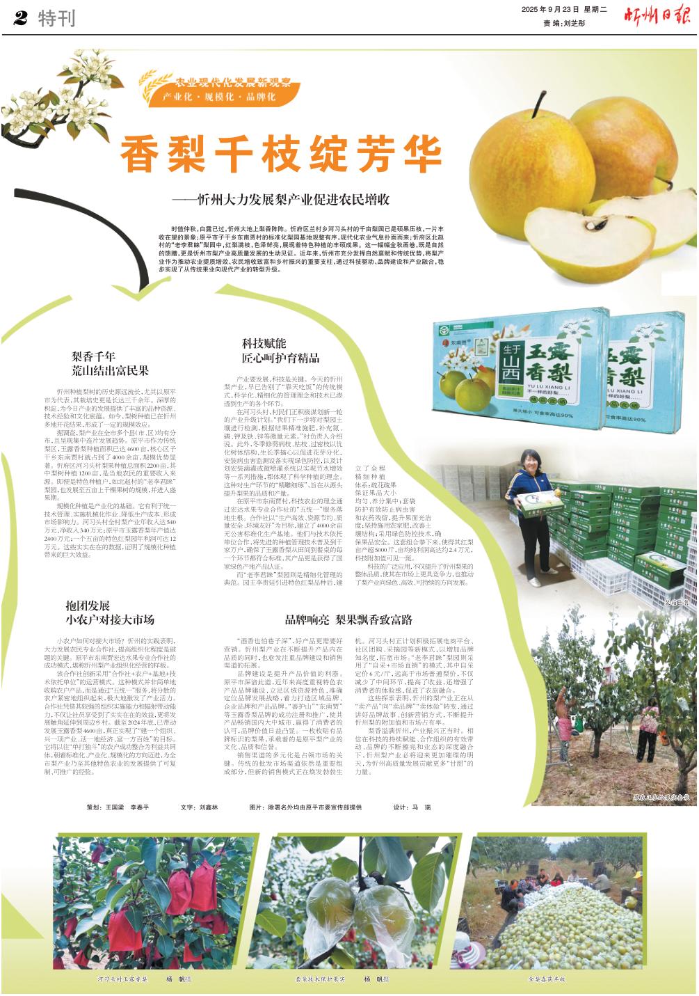 時值仲秋,白露已過,忻州大地上梨香陣陣。忻府區(qū)蘭村鄉(xiāng)河習(xí)頭村的千畝梨園已是碩果壓枝,一片豐收在望的景象;原平市子干鄉(xiāng)東南賈村的標準化梨園基地規(guī)整有序,現(xiàn)代化農(nóng)業(yè)氣息撲面而來;忻府區(qū)北趙村的“老李君睞”梨園中,紅梨滿枝,色澤鮮亮,展現(xiàn)著特色種植的豐碩成果。這一幅幅金秋畫卷,既是自然的饋贈,更是忻州市梨產(chǎn)業(yè)高質(zhì)量發(fā)展的生動見證。近年來,忻州市充分發(fā)揮自然稟賦和傳統(tǒng)優(yōu)勢,將梨產(chǎn)業(yè)作為推動農(nóng)業(yè)提質(zhì)增效、農(nóng)民增收致富和鄉(xiāng)村振興的重要支柱,通過科技驅(qū)動、品牌建設(shè)和產(chǎn)業(yè)融合,穩(wěn)步實現(xiàn)了從傳統(tǒng)果業(yè)向現(xiàn)代產(chǎn)業(yè)的轉(zhuǎn)型升級。