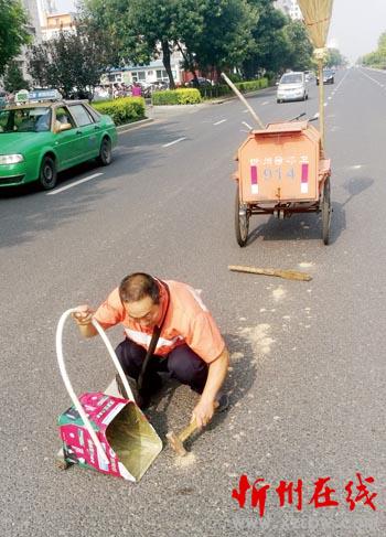 7月22日中午,忻州城區(qū)和平街,烈日當(dāng)頭,車(chē)水馬龍。這時(shí)記者看到在忻州師范學(xué)院路段,一位環(huán)衛(wèi)工人手執(zhí)小鐵錘,一絲不茍蹲在馬路上敲打撒落在路面上的粘泥,然后再用掃帚認(rèn)真清理干凈。這種敬業(yè)精神,值得大家學(xué)習(xí)。(赫在榮 攝)