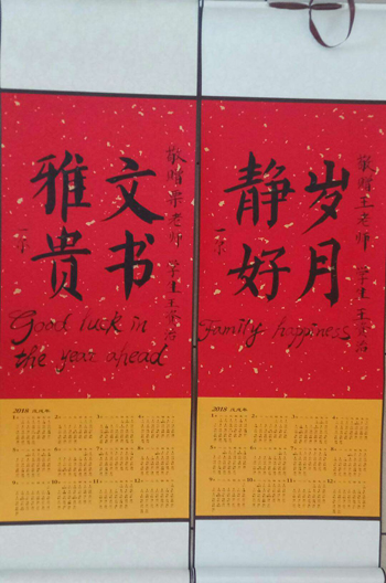 我市新觀念作家,雙語書法家,英語詞匯學者特意給毛里求斯姑娘送上新年的大祝福年歷。兩幅手寫的大楷福字下面是毛筆英文good luck in the year ahead.live long and prosper.