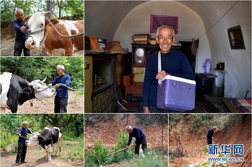 曹晉忠,男,1949年出生,山西省長治市武鄉(xiāng)縣鋪上村人。曹晉忠是村里的動物防疫員,自己種了4畝玉米、2畝小米。因為妻子常年臥病在床,曹晉忠一家是該村的精準(zhǔn)扶貧對象。曹晉忠說,醫(yī)護(hù)人員經(jīng)常上門進(jìn)行健康狀況隨訪,駐村工作隊也常來家里幫忙,現(xiàn)在看病不發(fā)愁,干活有人幫,生活挺好的。 右上:曹晉忠肖像;左上、左中、左下:曹晉忠在給村里的牛做檢查;下中、下右:曹晉忠在地里干農(nóng)活(拼版照片,6月12日攝)。 地處晉東南的山西省長治市,位于由太行山、太岳山環(huán)繞而成的上黨盆地中。在群山中、崖壁上,許多村莊自然條件惡劣,基礎(chǔ)設(shè)施落后,脫貧致富是大山深處人們的迫切心愿。 近年來,一場場脫貧攻堅戰(zhàn),在一個個深山村打響。政府全力探索脫貧路徑的同時,山區(qū)百姓因地制宜,靠自己的雙手和智慧走上致富路,交出了一份扎實的脫貧答卷。 記者在太行山、太岳山一路尋訪,記錄下多位70歲老人的生活。這些共和國的同齡人,親歷了山鄉(xiāng)的巨變,見證著長治山區(qū)脫貧攻堅偉大工程的一步步推進(jìn)。 新華社記者 詹彥 攝