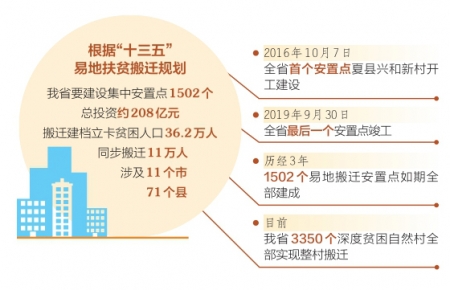 “十三五”易地扶貧搬遷啟動以來,我省有36.2萬貧困人口告別山莊窩鋪,搬進(jìn)了公共設(shè)施配套齊全、產(chǎn)業(yè)就業(yè)措施完善的1502個易地扶貧搬遷集中安置點(diǎn),這些安置點(diǎn)已成為貧困群眾穩(wěn)定脫貧的新起點(diǎn)、走向全面小康的新支點(diǎn)、實(shí)現(xiàn)鄉(xiāng)村振興的新亮點(diǎn)。