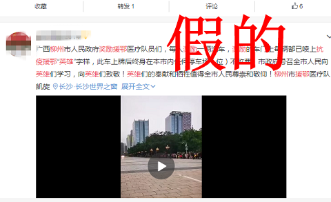 在一些微信群里,“柳州市獎勵援鄂醫(yī)療隊員們,每人獎勵一輛汽車,獎勵的車門上每輛都已噴上抗疫援鄂‘英雄’字樣,此車上牌后終身在本市內任何停車場(位)不收費”的信息比比皆是。在抖音和微博平臺,還有不少網友以該信息為基礎,配上了迎接援鄂抗疫英雄回柳的畫面,制作成了短視頻在網絡上傳播,加劇了虛假信息進一步傳播。