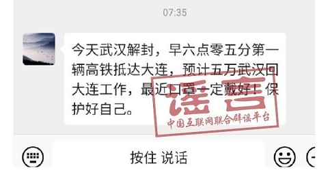 4月8日,有消息稱:“今天武漢解封,早六點(diǎn)零五分第一輛高鐵抵達(dá)大連,預(yù)計(jì)五萬(wàn)武漢人回大連工作,最近口罩一定戴好……”。