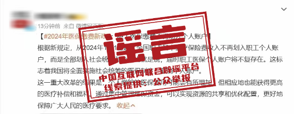 真相:近日,一篇名為《職工注意!2024年起,職工醫(yī)保繳費將徹底改變》的文章和相關(guān)截圖在網(wǎng)上傳播,文中聲稱“職工醫(yī)保費將不再劃入個人賬戶”“個人將不再有自己的醫(yī)保賬戶”。對此,10月27日,國家醫(yī)保局發(fā)布辟謠聲明稱,上述相關(guān)內(nèi)容純屬造謠。