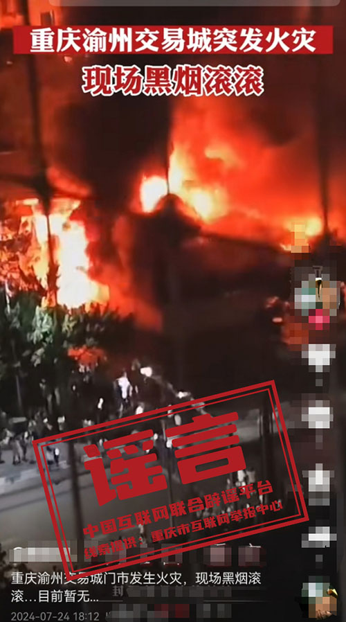 真相:7月25日,網(wǎng)上一則“倉山萬達(dá)(王莊世歐廣場)被淹”的視頻,引發(fā)關(guān)注。經(jīng)福建省福州市聯(lián)排聯(lián)調(diào)中心核查,網(wǎng)傳視頻為往年的舊視頻,其所在位置也并非倉山萬達(dá),實(shí)際位于王莊世歐廣場及其周邊。福州市晉安區(qū)有關(guān)部門進(jìn)行現(xiàn)場勘察,證實(shí)當(dāng)?shù)匾磺姓#o明顯積水。倉山萬達(dá)廣場也無明顯積水。網(wǎng)傳視頻為不實(shí)信息。(來源:“福建辟謠”微信公眾號(hào)) 謠言:重慶渝州交易城突發(fā)火災(zāi)?