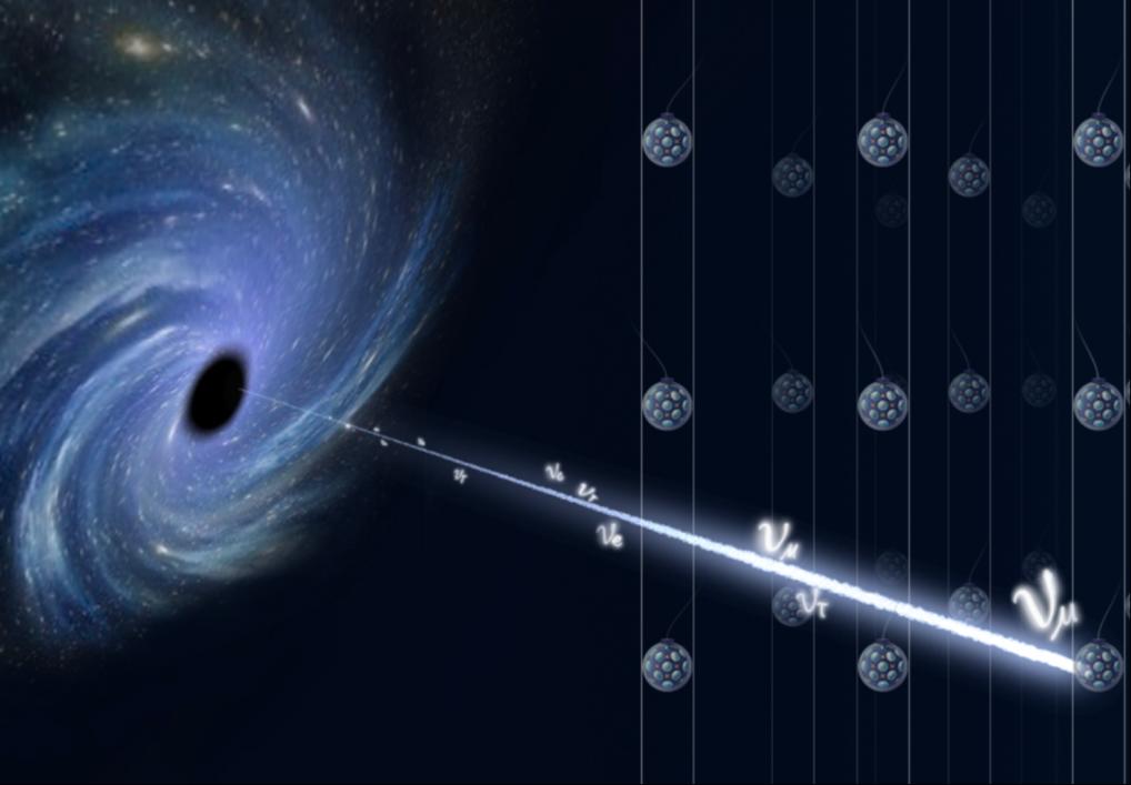 中微子天文圖示。中微子可輕松逃逸極端、致密的宇宙和天體環(huán)境,其在宇宙中傳播不因磁場而改變方向,是追根溯源、研究極端天體現(xiàn)象的理想信使。(受訪者供圖)