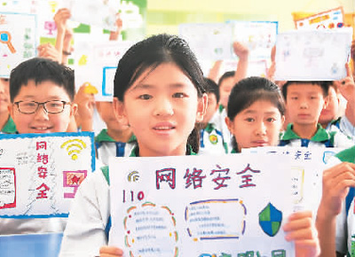 河北省邯鄲市永年區(qū)洺州小學的孩子們展示網絡安全手抄報。胡高雷攝(人民視覺)