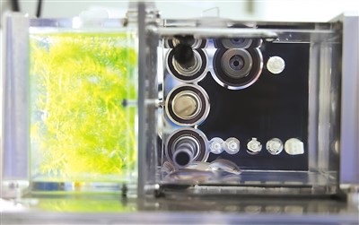 在問天艙生命生態(tài)實驗柜小型受控生命生態(tài)實驗模塊中,魚類、植物和微生物協(xié)同參與——藻類光合作用產(chǎn)生的氧氣供斑馬魚呼吸,魚呼出的二氧化碳供藻類進行光合作用,進食產(chǎn)生的糞便則提供了藻類生長的養(yǎng)料。在飲食方面,科學家專門設(shè)計了魚食,用注射器推進“魚缸”。