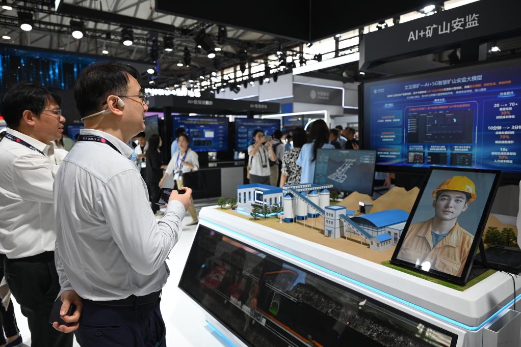 6月18日,觀眾在中國移動(dòng)展臺(tái)了解“AI+礦山安監(jiān)”技術(shù)方案。新華社記者 陳愛平 攝