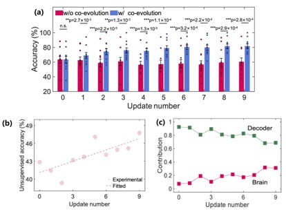 (a)協(xié)同演進腦機解碼正確率較初始狀態(tài)提高20%;(b)任務(wù)相關(guān)腦電特征發(fā)生正向演化;(c)腦與憶阻器解碼器實現(xiàn)互適應(yīng)。(聯(lián)合研究團隊供圖)