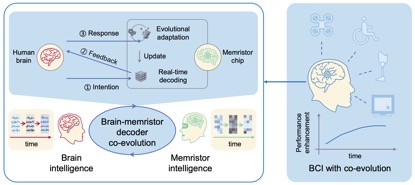 天津大學(xué)與清華大學(xué)的聯(lián)合研究團隊針對這一難題,發(fā)現(xiàn)腦電信號的非平穩(wěn)特性與任務(wù)腦電演變密切相關(guān)?;诖?,他們創(chuàng)新性地提出了“雙環(huán)路腦機協(xié)同演進框架”,并通過憶阻器神經(jīng)形態(tài)器件加以實現(xiàn)。在“雙環(huán)路”框架下,腦與機的學(xué)習(xí)環(huán)路相互協(xié)同,共同促進系統(tǒng)性能的提升。