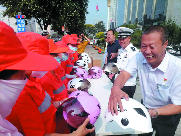 今年是我市創(chuàng)建全國文明城市的決戰(zhàn)決勝年,廣大環(huán)衛(wèi)工人一直默默奮斗在崗位上,為我市創(chuàng)文不斷努力。市公安局交警支隊始終牽掛著奮戰(zhàn)在基層一線的環(huán)衛(wèi)工人,支隊以此次贈送頭盔活動為契機,持續(xù)關(guān)心關(guān)愛環(huán)衛(wèi)工人的生命安全和身體健康。市公安局交警支隊負責人表示:“環(huán)衛(wèi)工人大多騎著電動三輪車或人力保潔車穿梭在大街小巷,機動車道是他們的主要作業(yè)區(qū)之一,佩戴安全頭盔,可以大大增加他們的安全系數(shù)。同時,環(huán)衛(wèi)等重點行業(yè)的示范引領(lǐng)作用,將有力帶動市民遵紀守法、安全出行,為文明城市創(chuàng)建打造一道亮麗的風景線?!眻D為捐贈活動現(xiàn)場。張志遠 攝影報道