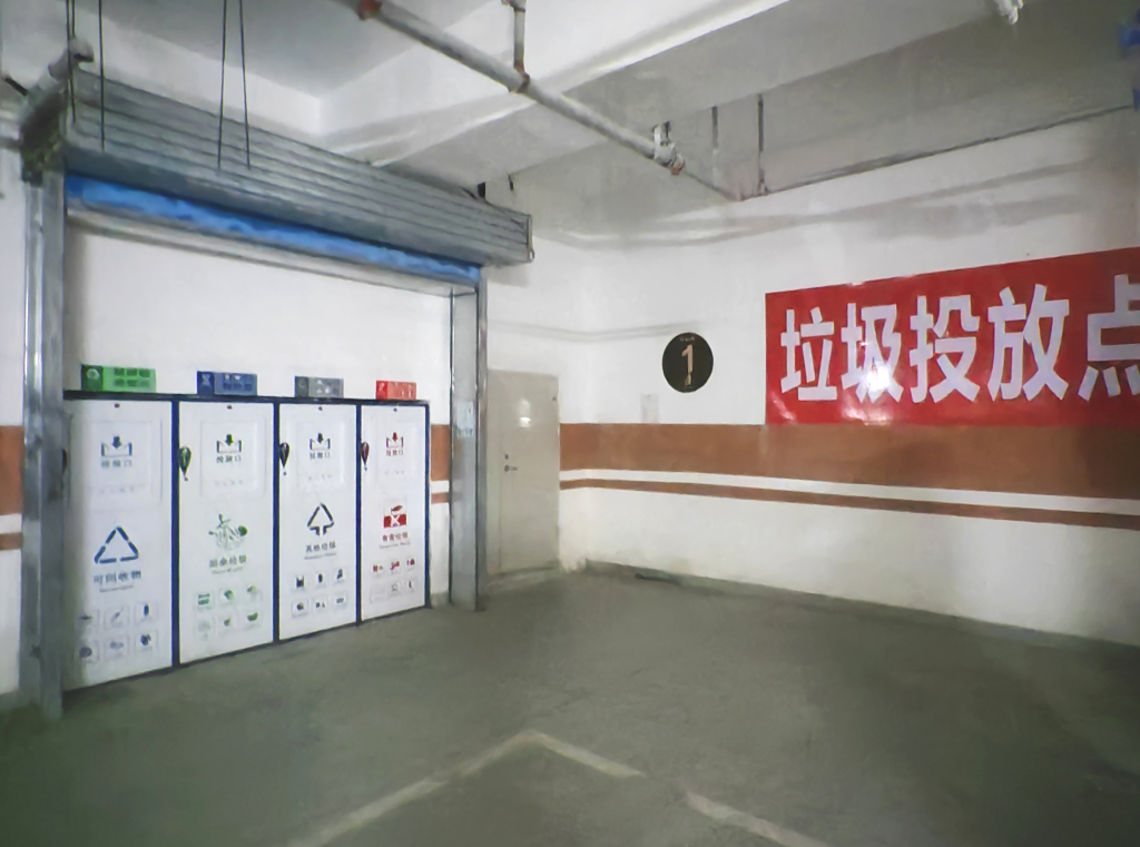 樹華園小區(qū)里沒有地面垃圾桶,只在一些日常人流密集區(qū)域設置有果皮箱和垃圾回收機。小區(qū)共有36棟住宅樓,按照每三到五棟樓為一個組團,在地下停車場集中設置了垃圾分類投放點。