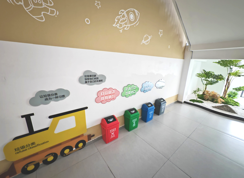 3月28日,悅容小學教學樓內的垃圾分類箱。新華社記者楊帆攝