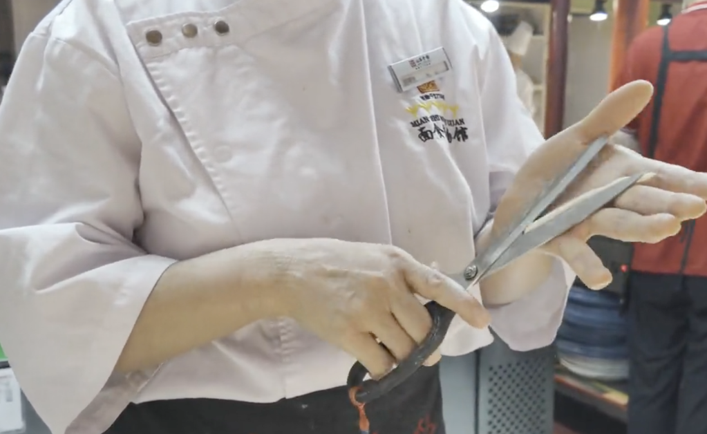 圖為夾心面。新華社記者 王怡靜 攝??關(guān)于剪刀面的故事很動人——“‘剪子面,兩頭尖,吃到肚里胃不酸’。相傳剪刀面是以前喬家大院的喬貴發(fā)走西口的時候,留在家里的妻子為丈夫裁剪衣服,由于過于思念丈夫,一走神就把剪刀也帶到了廚房里,于是便有了剪子面?!覆凰帷?,其實也是‘心不酸’?!崩铉f。剪刀面一般用來做湯面,配蔬菜吃,也有著希望家人安康的寄托。