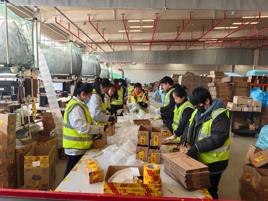 1月22日,在位于山東煙臺(tái)的日韓消費(fèi)品跨境電商中心京東綜合倉(cāng)內(nèi),工作人員將貨物分揀、打包。新華社記者 邵琨 攝