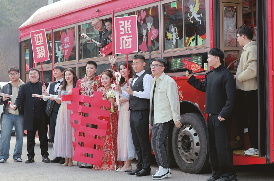 3月10日,在臨汾市區(qū)濱河路,一對(duì)新人在23路“1314”幸福主題公交巴士前拍照留念。隨著新時(shí)代婚禮習(xí)俗觀念的改變,年輕人選擇公交當(dāng)婚車(chē),成為當(dāng)下一種時(shí)尚創(chuàng)新的婚禮形式。