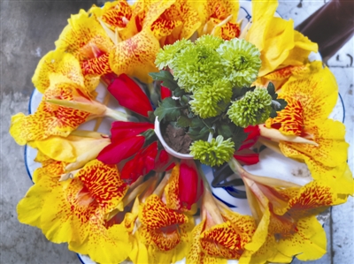 他的菜攤與眾不同,擺著五顏六色的鮮花:青菜配美人蕉、芹菜配梔子花、空心菜配菊花、香蔥配紅花……他穿著西裝、打著領(lǐng)帶賣菜,面對(duì)顧客,總是樂呵呵的。他的樂觀感動(dòng)了很多人,生意因此火爆。