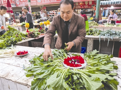 “那時(shí)孩子在成都理工大學(xué)上學(xué),家里經(jīng)濟(jì)壓力很大?!?年前,王美成接替妻子開始在城區(qū)賣菜,他發(fā)現(xiàn)有時(shí)菜并不好賣?!坝幸淮挝胰ゾ频陞⒓友鐣?huì),看到酒店里有的菜品裝飾挺好看,我就想是不是也可以把花裝飾在菜攤上。嘗試之后發(fā)現(xiàn)效果挺好,大家都喜歡。”