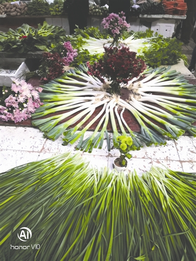 于是,王美成撿來(lái)廢棄的酒瓶子當(dāng)花瓶插花,每一處花瓶下擺放的都是不一樣的蔬菜,每天攤位上能見著七八種不同形狀的蔬菜造型花樣。6年來(lái),他一直堅(jiān)持?jǐn)[攤,在不同的季節(jié)用不同的鮮花進(jìn)行搭配。
