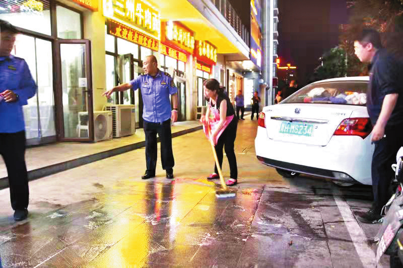 據(jù)了解,此次行動(dòng)共出動(dòng)執(zhí)法人員近30名。通過專項(xiàng)整治,進(jìn)一步規(guī)范了城區(qū)商鋪的經(jīng)營秩序,提升了居民的環(huán)保意識和文明意識,營造了和諧文明的市容環(huán)境。圖為執(zhí)法人員與商家一同清理店鋪門前油污。(記者張志遠(yuǎn) 攝影報(bào)道)