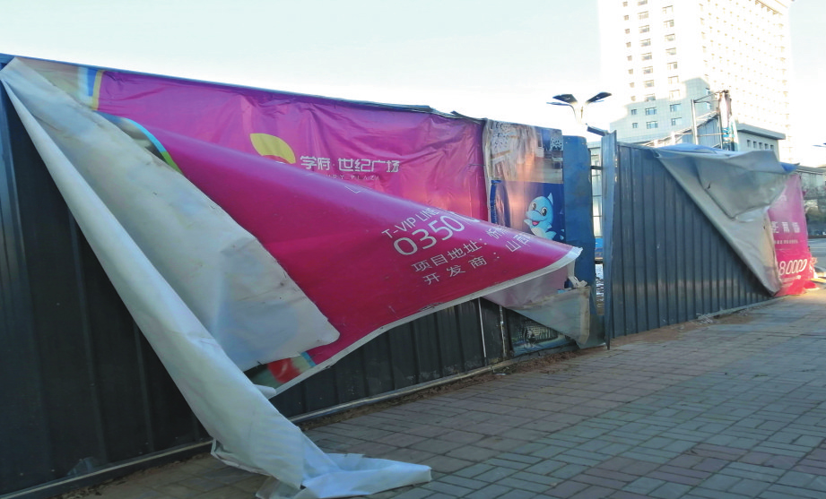近日,受大風(fēng)影響我市城區(qū)幾處廣告牌被刮損,有的甚至有墜落危險(xiǎn),希望相關(guān)部門采取措施及時(shí)修復(fù),也提醒廣大市民如遇大風(fēng)天氣,應(yīng)盡量減少外出,出門時(shí)要盡量遠(yuǎn)離高層建筑物和廣告牌。(記者 李 濤 攝影報(bào)道)