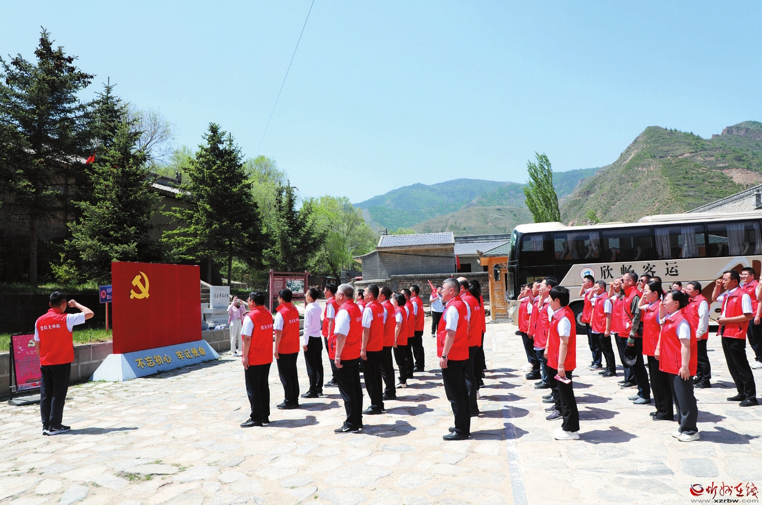 近日,農(nóng)行忻州分行機關(guān)組織全體黨員前往繁峙縣伯強村毛主席路居紀念館開展主題黨日活動。在紀念館前,全體黨員面對黨旗莊嚴宣誓,重溫入黨誓詞,接受了一次深刻的紅色教育洗禮。(王燦 攝)