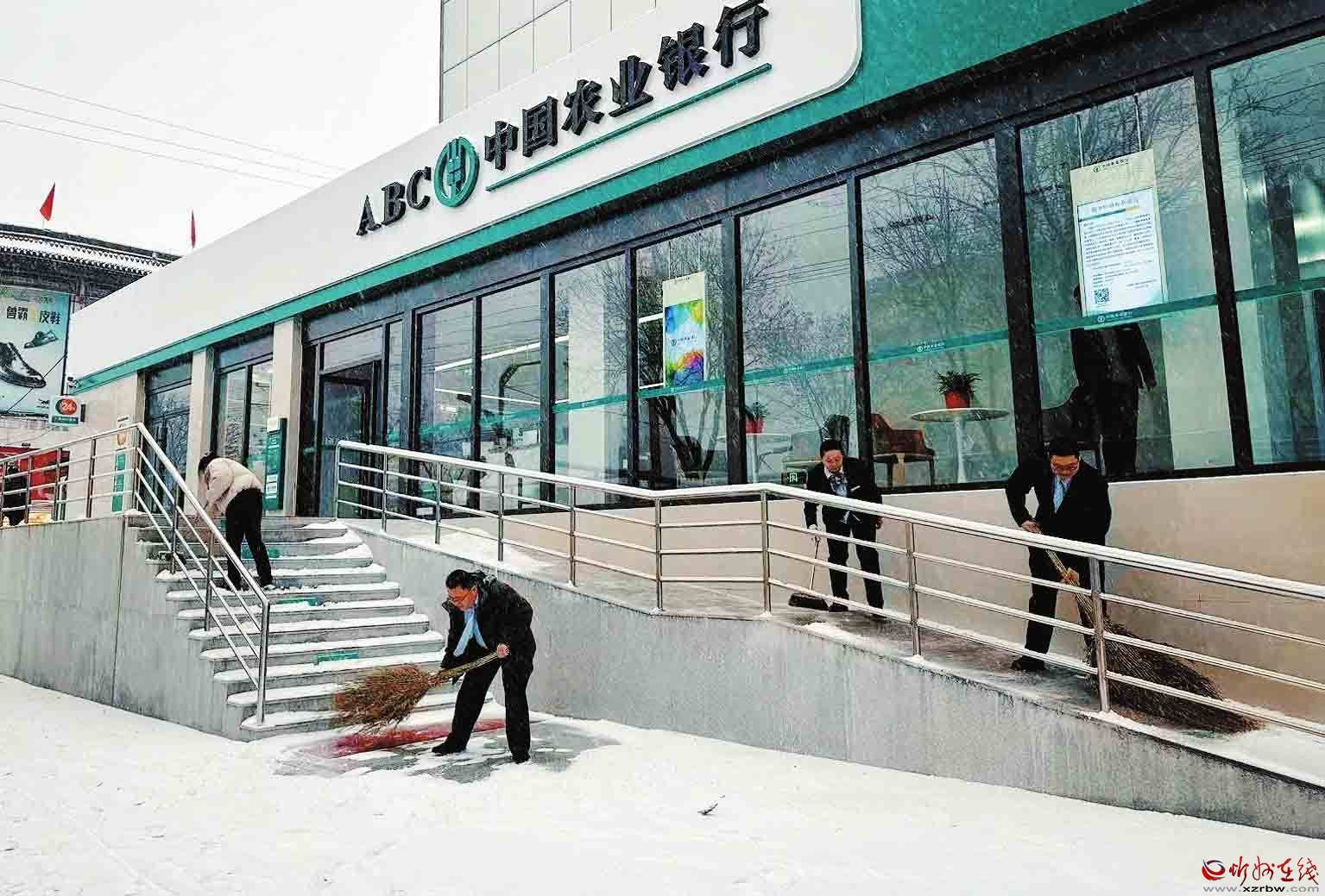 面對我市首場強(qiáng)降雪,農(nóng)行忻州分行員工以雪為令,及時(shí)清掃網(wǎng)點(diǎn)及周邊區(qū)域,確保服務(wù)通道暢通無阻,以實(shí)際行動(dòng)傳遞了溫暖的金融服務(wù)。(殷俊攝)