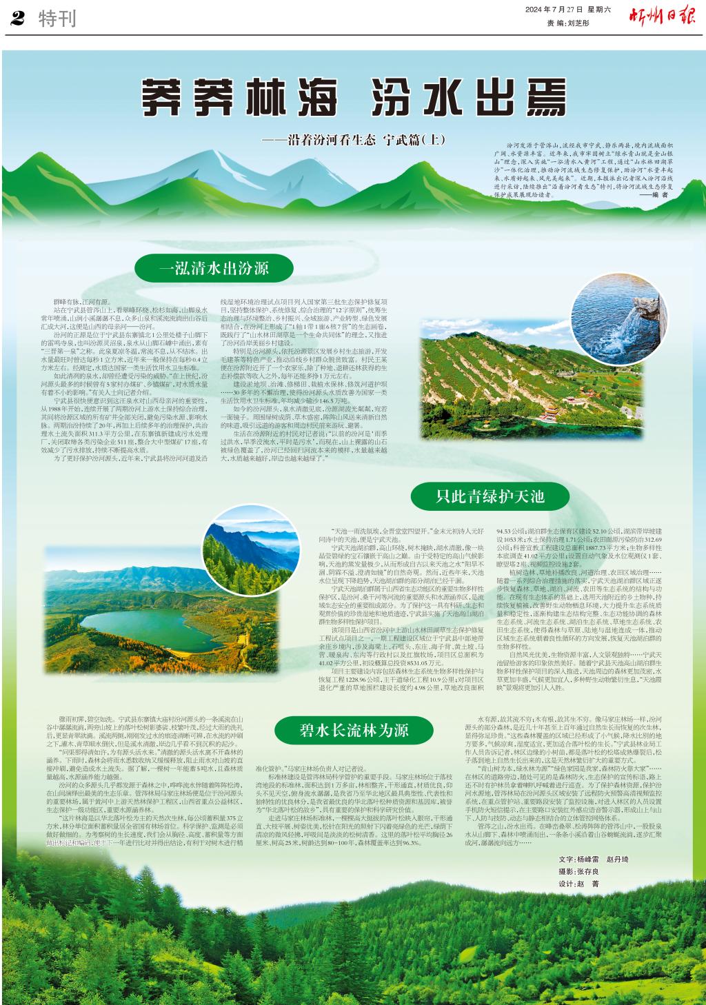汾河發(fā)源于管涔山,流經(jīng)我市寧武、靜樂兩縣,境內(nèi)流域面積廣闊、水資源豐富。近年來,我市牢固樹立“綠水青山就是金山銀山”理念,深入實施“一泓清水入黃河”工程,通過“山水林田湖草沙”一體化治理,推動汾河流域生態(tài)修復保護,助汾河“水量豐起來、水質(zhì)好起來、風光美起來”。近期,本報派出記者深入汾河沿線進行采訪,陸續(xù)推出“沿著汾河看生態(tài)”特刊,將汾河流域生態(tài)修復保護成果展現(xiàn)給讀者?!?者