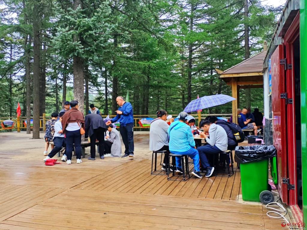 馬侖草原蘆芽山游客服務(wù)站一側(cè),坐在桌旁休憩的游客