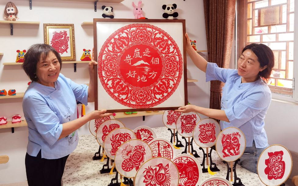 8月8日,忻州市民間工藝美術(shù)大師、非物質(zhì)文化遺產(chǎn)傳承人韋東梅與工作人員現(xiàn)場展示剪紙作品。新華網(wǎng) 任鈺 攝