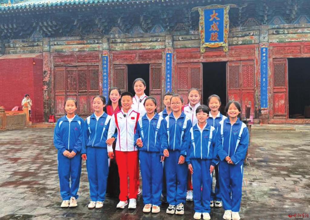 當(dāng)日,在代州文廟,3位奧運(yùn)冠軍與學(xué)生入泮池、跨壁橋,為學(xué)生朱砂開(kāi)智,帶學(xué)生破蒙識(shí)字,并與學(xué)生進(jìn)入大成殿拜孔子;登邊靖樓,賞代縣非遺道情戲;走進(jìn)代縣第四中學(xué)校,“手把手”教學(xué)生們?nèi)瓝魟?dòng)作。