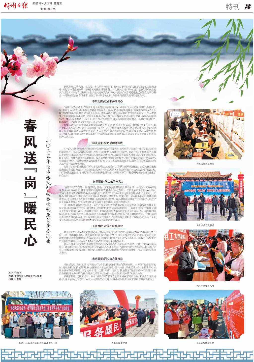 春潮涌動(dòng),萬物競(jìng)發(fā)。在黨的二十大精神的指引下,我市以“春風(fēng)行動(dòng)”為抓手,錨定就業(yè)優(yōu)先戰(zhàn)略,掀起了一場(chǎng)覆蓋全域、精準(zhǔn)施策的就業(yè)服務(wù)熱潮。從代縣文昌祠廣場(chǎng)的崗位“盛宴”到五寨縣迎賓廣場(chǎng)的鄉(xiāng)村振興專場(chǎng)招聘,從偏關(guān)縣太虎坡文化廣場(chǎng)的“龍?zhí)ь^”古會(huì)到易地搬遷安置點(diǎn)的暖心服務(wù),一場(chǎng)場(chǎng)招聘會(huì)如春風(fēng)化雨,潤(rùn)澤萬千求職者的心田,為忻州高質(zhì)量發(fā)展增添蓬勃生機(jī)。
