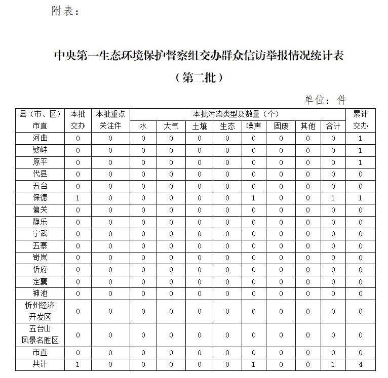 截至5月30日,中央第一生態(tài)環(huán)境保護督察組累計向我市交辦信訪件4件,其中重點關注件0件。交辦的信訪件中,涉及原平市1件、河曲縣1件、繁峙縣1件、保德縣1件;涉及生態(tài)環(huán)境問題4個,其中水污染問題1個、大氣污染問題1個、生態(tài)破壞問題1個、噪聲污染問題1個。