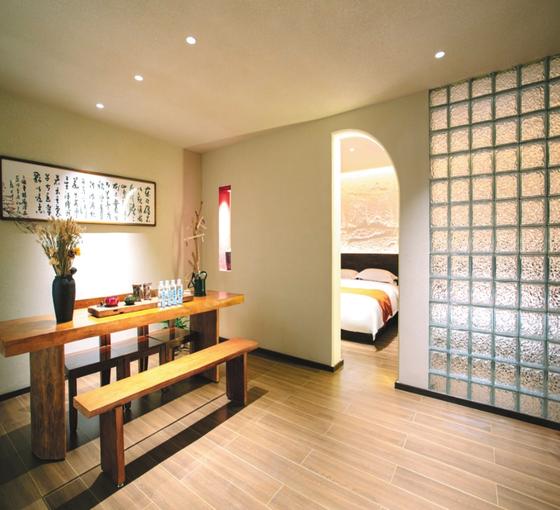 牧瑤溫泉民宿位于忻府區(qū)南關(guān)村。走進院內(nèi),大片玻璃窗通透明亮,門前蒼松與其他綠植讓人心曠神怡,潺潺流水和中式亭子的造景,增添了許多的靈動韻味。
