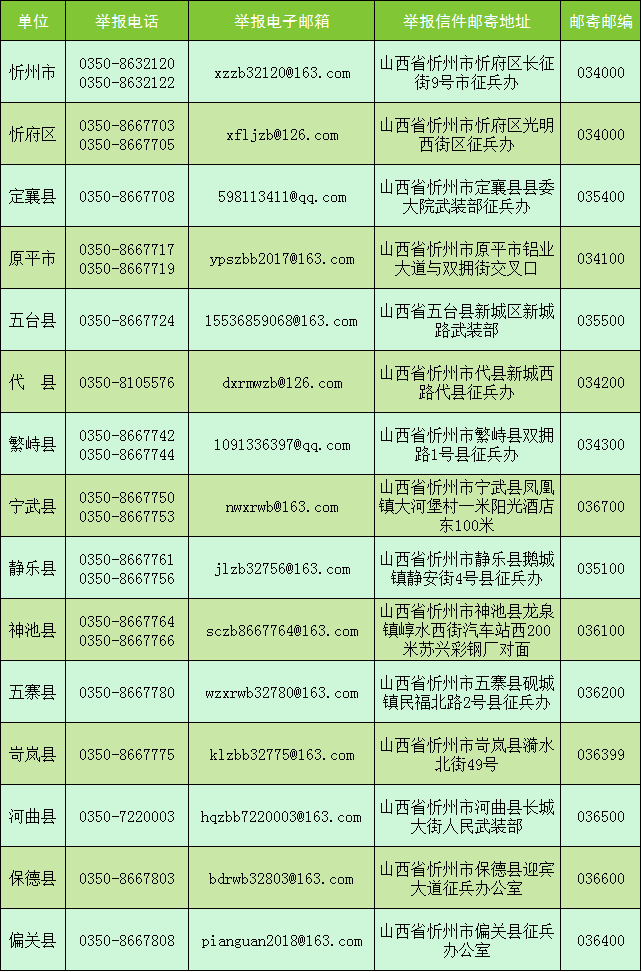 為認(rèn)真貫徹落實(shí)上級(jí)關(guān)于廉潔征兵的政策規(guī)定,維護(hù)廣大應(yīng)征青年的合法權(quán)益,嚴(yán)明征兵紀(jì)律,拓寬監(jiān)督渠道,營造風(fēng)清氣正的征兵環(huán)境,現(xiàn)將2025年忻州市級(jí)廉潔征兵監(jiān)督員和市縣兩級(jí)舉報(bào)電話、郵箱等信息予以公示,歡迎全社會(huì)對(duì)征兵工作進(jìn)行監(jiān)督。 一、市級(jí)廉潔征兵監(jiān)督員舉報(bào)電話
